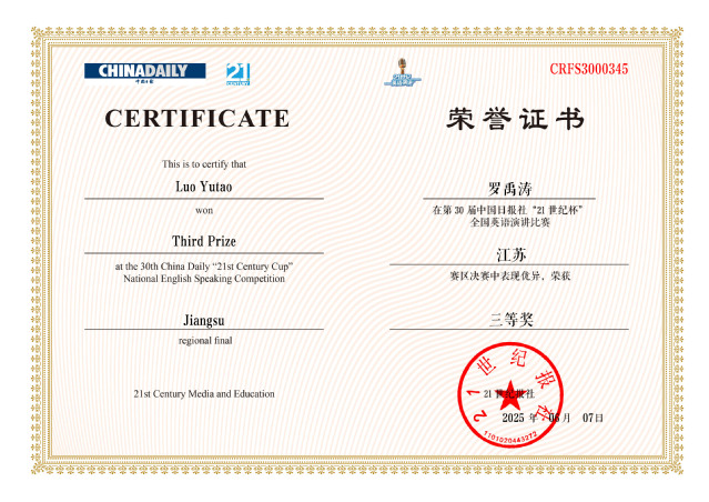 6月7日,第30届中国日报社“21世纪杯”全国英语演讲比赛江苏省赛决赛在南京理工大学圆满落幕。公司选派两名优秀学子参赛,凭借出色的英语表达能力、严密的逻辑思维能力、迅速现场反应力及出色的舞台表现力,bw必威西汉姆联官网金奕彤同学在来自南京大学、东南大学、南京理工大学等全省80名优秀参赛选手的激烈竞争中脱颖而出,荣获江苏省一等奖,顺利晋级国赛,罗禹涛荣获江苏省三等奖。金奕彤同学作为优秀选手,接受21世纪报记者视频采访。