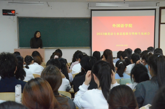 2023年10月25日下午,bw必威西汉姆联官网举办了2023级英语专业思想教育暨师生见面会。外国语公司党委书记周珊珊、经理张秀萍、英语专业全体教师以及2023级英语专业新生参加了本次活动。见面会由副书记范迎波主持。