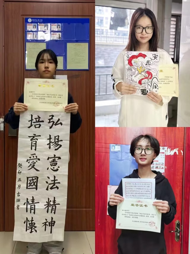 同学通过硬笔和软笔两种方式用心书写每一笔画、每一个汉字,一笔一墨绘就书法风骨,一撇一捺彰显法治精神。书法作品笔画流畅,横平竖直,绘画作品构图错落有致,整体美观,书法绘画作品与宪法交相辉映,让同学们切身感受法治与书画融合的魅力。